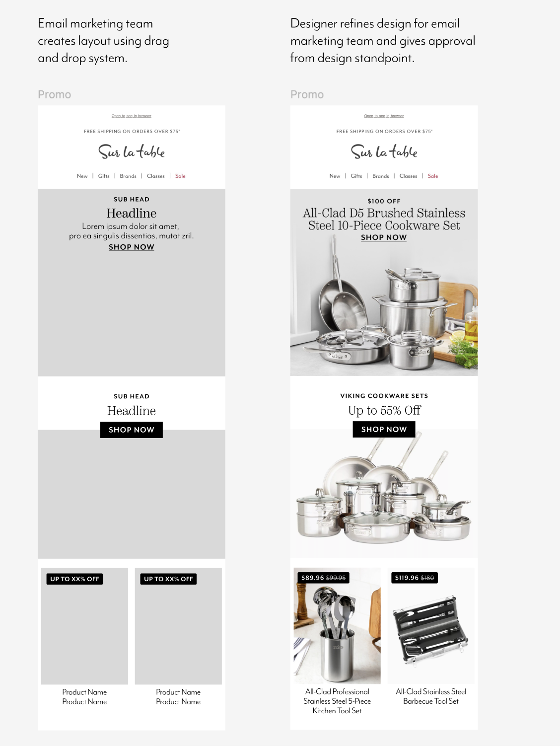 This led to growing inefficiencies and visual inconsistencies across Sur La Table’s high-volume email campaigns—costing time and increasing design debt with each send.
